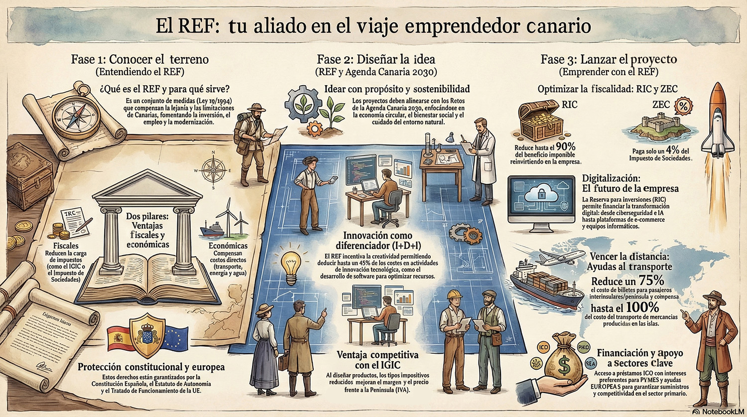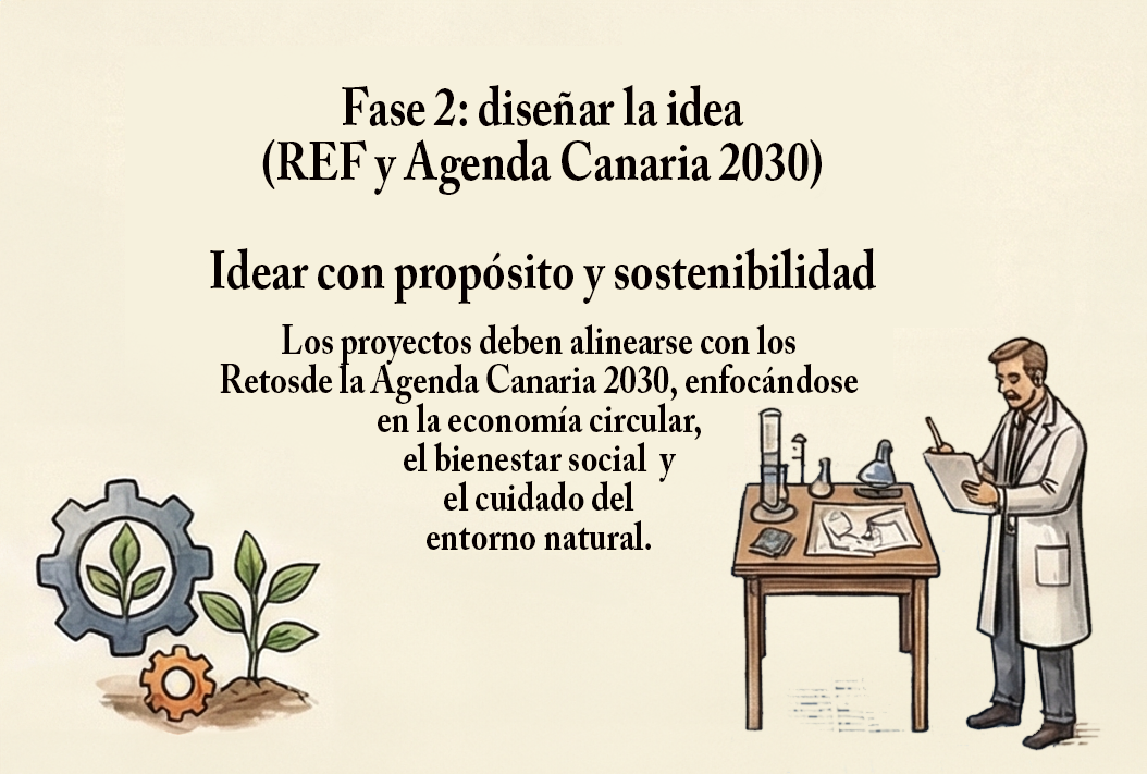 Antes de entrar en los contenidos, consulta la siguiente infografía. Recoge de un vistazo las tres fases que vas a trabajar en esta unidad: conocer el REF, idear proyectos vinculando el REF con la Agenda Canaria 2030 y emprender con el REF.